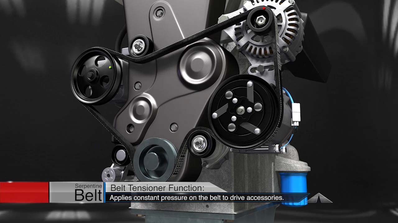 The serpentine belt tensioner applies pressure to the serpentine belt, maintaining prime tension to drive the accessories like the alternator and A/C compressor. The service life of the belt tensioner is the same as the belt itself, so they should always be replaced together. A worn tensioner prevents the accessories from spinning properly, leading to premature wear and noise.